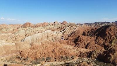 landform developed in the arid regions of northern China, and the only area in China where Danxia landforms and colorful hills are highly composite. The park mainly consists of Cretaceous red beds formed between 135 million and 65 million years ago, sculpted by water and wind erosion. The Danxia landform group ranges in altitude from 2,000 to 3,800 meters, stretching approximately 40 kilometers east to west and 5 to 10 kilometers north to south, covering an area of over 300 square kilometers. The park is characterized by its vibrant colors, high scenic value, and vast area, combining grandeur, ruggedness, wonder, tranquility, and beauty. Within the park are seven scenic spots, including the Seven-Colored Cloud Sea, Seven-Colored Fairyland, Seven-Colored Brocade, Seven-Colored Rainbow, Crouching Tiger Gorge, Seven-Colored Ao River, and Wanxiang Earth Forest Valley. There are also over 30 scenic spots such as Divine Dragon Playing with Fire, Monkey Watching the Sea, Monks Worshiping Buddha, Divine Turtle Asking the Heavens, Golden Toad Asking the Way, Giant Scallop, Seven-Colored Screen, Sleeping Beauty, and Crouching Tiger.