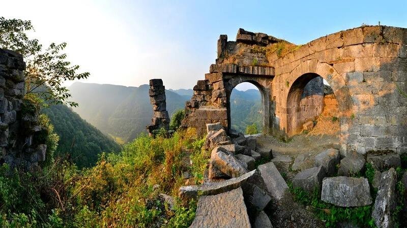 Song Dynasty's Baoyou emperor era, and was destroyed in 1600 A.D. during the Ming Dynasty's Suppression War Campaign. This site stands as a crucial cultural relic of the Yang family's king system of Tusi in southwestern Bozhou prefecture, spanning the Song, Yuan, and Ming dynasties. The fortress features nine strategic passes: six front passes (Tongzhu Pass, Tiezhu Pass, Feihu Pass, Feilong Pass, Chaotian Pass, and Feifeng Pass) and three rear passes (Wan 'an Pass, Erdao Pass, and Toudao Pass). More than a military stronghold, Hai Long Tun is now a living testament to Tusi civilization etched into the landscape. From the winding earthen walls of Baoyou emperor's era to the crumbling fortifications of Wanli emperor's reign, these remnants vividly document the evolution of frontier governance, serving as a three-dimensional chronicle of China's unification process.
