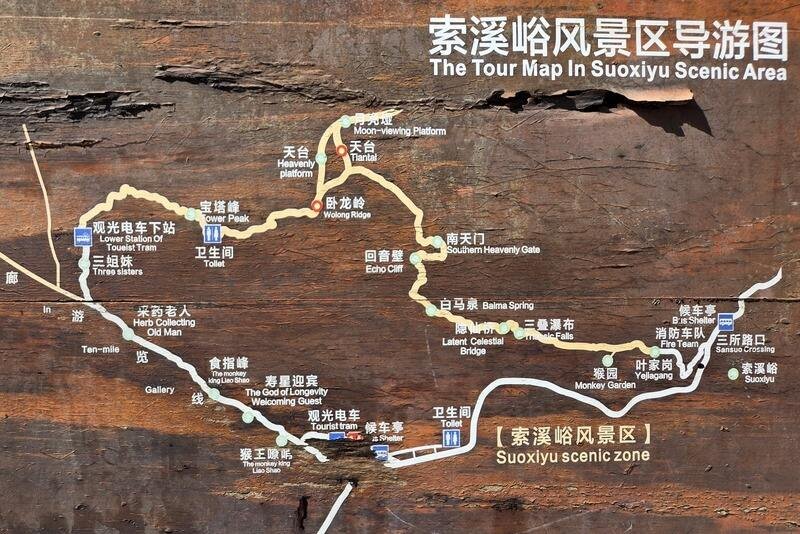 The three original subsections of Wulingyuan Scenic Area form a horizontally-oriented triangle whose southern point is Zhangjiajie National Forest Park, whose northern point is Tianzi Mountain Nature Reserve and whose eastern point is Suoxi Valley Nature Reserve (a fourth subsection, Yangjiajie Scenic Area, was later added).